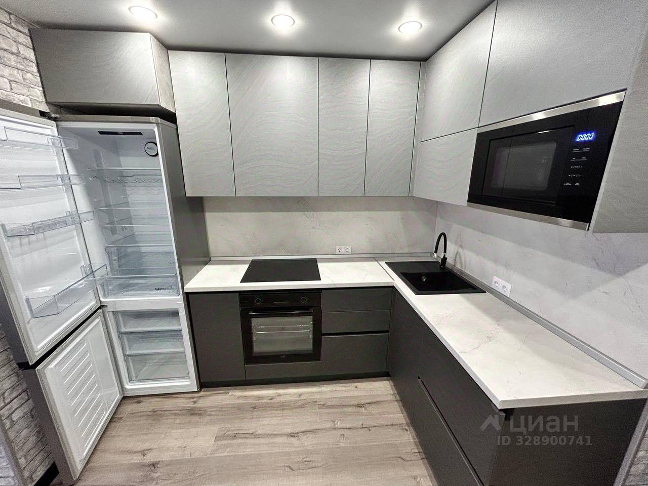 Просторный кухонный гарнитур с вместительными ящиками и органайзерами для посуды и столовых приборов. В наличии сама посуда и приборы. Техника: индукционная плита, микроволновая печь, электрочайник. Полный комплект посуды для приготовления пищи.