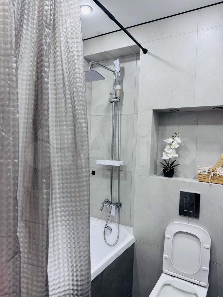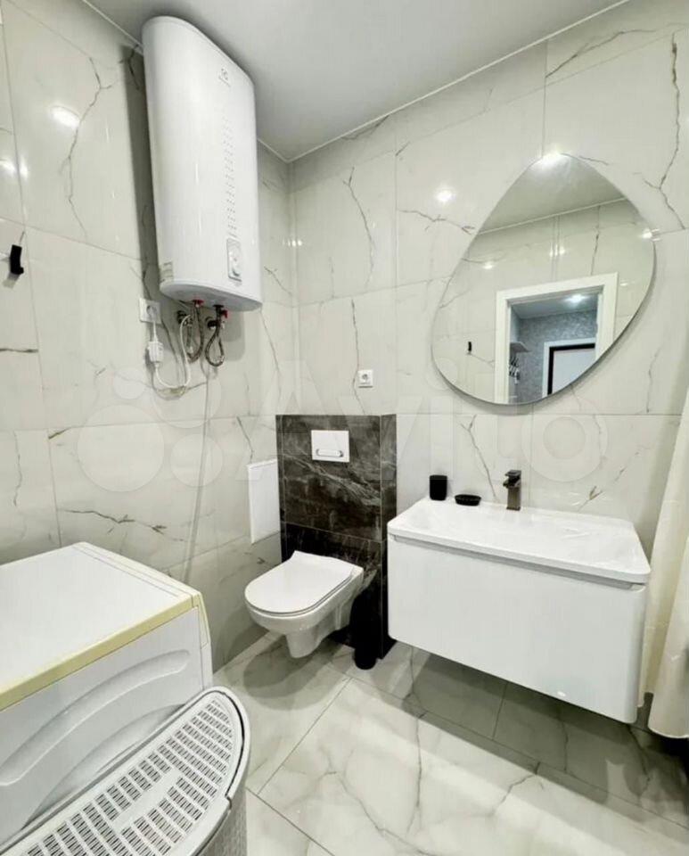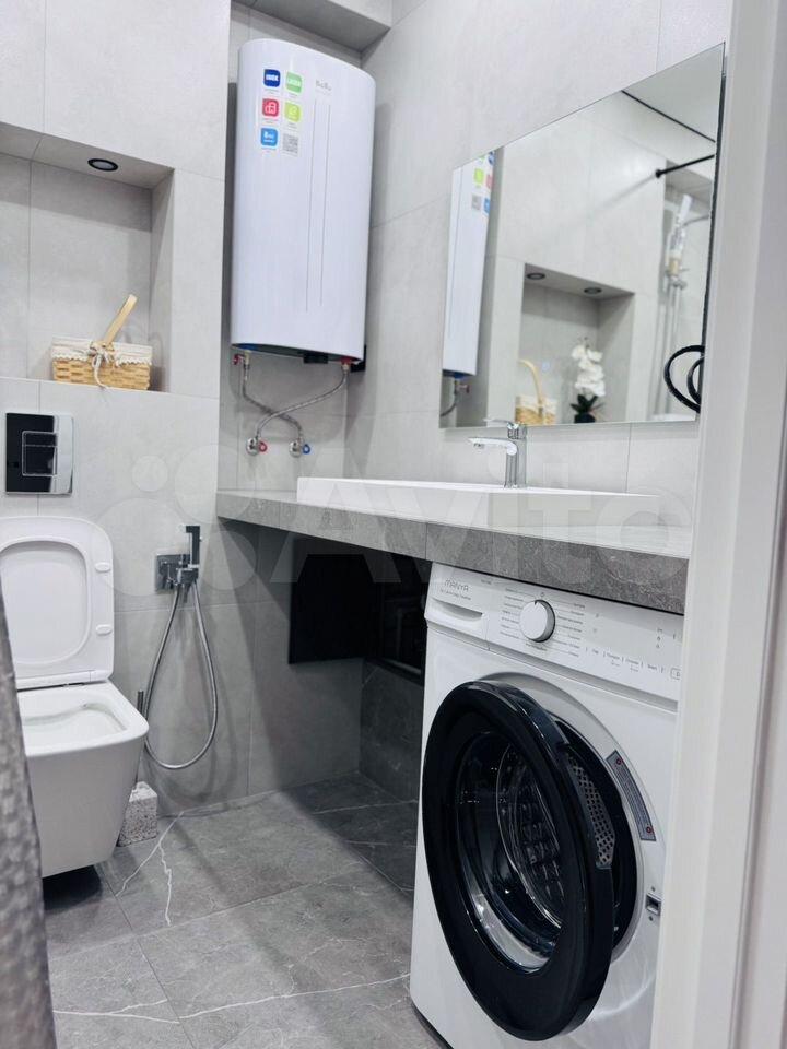 Санузел совмещенный, в современном стиле. Есть стиральная машина и водонагреватель.